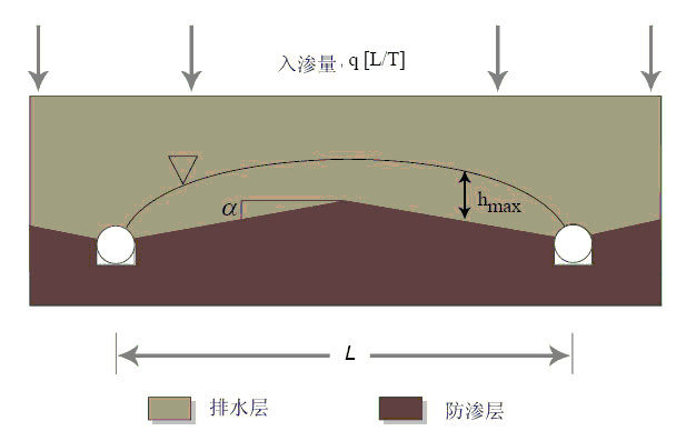 大部分垃圾填埋场中,超过坡度范围的土工合成材料厚度小于20mm,可以使用Giroud简化公式计算出排水管间距。
