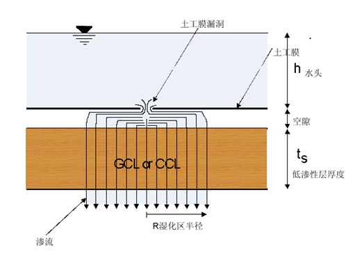 滞留的液体处于复合衬垫的土工膜上面,若果土工膜有缺陷,液体首先通过土工膜的缺陷,然后通过土工膜与低透水性土间的一段空间,最后进入并通过低渗透土层。处于土工膜和土层间隙的液体流称为界面流,界面流流经的区域成为湿化区,土层中的水流经过湿化区变为垂直方向,R为湿化区半径。